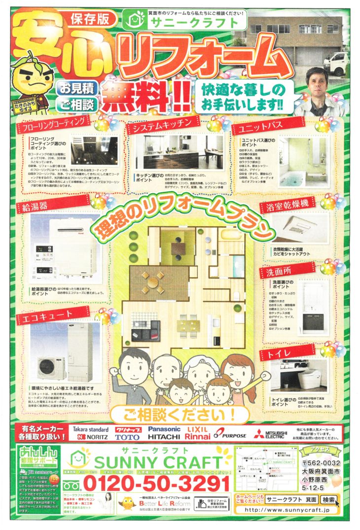 お問い合わせ お見積もり お得な価格表 無料見積り・相談 電話で見積り・相談 0120-50-3291 【受付】8:00~18:00【定休日】日曜日・祝日 電話で見積り・相談 HOMEイベント情報リフォームチラシ箕面市 安心リフォーム 箕面市 安心リフォーム リフォームチラシ一覧はこちら イベント情報一覧はこちら サニークラフトについて 選ばれる理由 会社案内会社概要代表挨拶スタッフ紹介企業理念所属団体アクセスマップ 施工事例 施工事例一覧 浴室リフォーム キッチンリフォーム トイレリフォーム 浴室乾燥機 給湯器交換 お客様の声 お客様の声一覧 お得なリフォーム情報 チラシオススメ特価商品 LIXIL リノビオV 1216サイズ ¥561,500(税込) キッチン クリナップ ラクエラ I型240cm ¥412,100(税込) 浴室 LIXIL リノビオV 1216サイズ ¥561,500(税込) トイレ TOTO GG-800 洗面台 LIXIL Piara(ピアラ) ¥149,800~(税込) 価格表一覧 チラシオススメ特価商品 キッチン TOTO LIXIL 浴室 TOTO LIXIL トイレ 洗面台 お役立ち情報 よくある質問 リフォームの流れ スタッフブログ あんしん修理サポート イベント情報 イベント情報一覧 お知らせ 新着情報 SNS リフォーム提案会 キャンペーン リフォームチラシ 相談会 お問い合わせ お問い合わせ リフォーム相談(無料) サービス提供エリアのご案内大阪府箕面市にある店舗・ショールームから、すぐに伺える範囲を提供エリアとさせていただいております。適切なサービスをご提供させていただくために設定させていただいております。弊社でのご提供価格は、「お得なメニュー」に掲載されている商品を合わせてご覧ください。箕面市以外の地域にお住まいのお客様もぜひ一度お問い合わせください。 CONTACT お問い合わせ リフォームを勉強したい イベント参加お申し込みはこちら リフォームのプロへ相談 無料相談はこちら リフォームのお金の相談 お見積もりはこちら 企業理念 代表挨拶 会社概要 スタッフ紹介 アクセスマップ トップへ戻る 会社案内 会社案内会社概要代表挨拶スタッフ紹介企業理念所属団体アクセスマップ 施工事例一覧 施工事例一覧 浴室リフォーム キッチンリフォーム トイレリフォーム 浴室乾燥機 給湯器交換 お客様の声 お客様の声一覧 お得なリフォーム情報 価格表 一覧キッチン浴室トイレ洗面台 イベント情報 イベント情報一覧 お役立ち情報 よくある質問リフォームの流れスタッフブログあんしん修理サポート お問い合わせ お問い合わせリフォーム相談(無料) Copyright 2018 株式会社サニークラフト