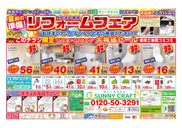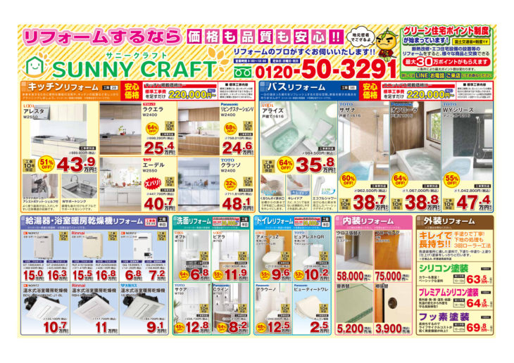 お問い合わせ お見積もり お得な価格表 無料見積り・相談 電話で見積り・相談 0120-50-3291 【受付】8:00~18:00【定休日】日曜日・祝日 電話で見積り・相談 HOMEイベント情報リフォームチラシ【リフォームフェア】チラシ 【リフォームフェア】チラシ リフォームチラシ一覧はこちら イベント情報一覧はこちら サニークラフトについて 選ばれる理由 会社案内会社概要代表挨拶スタッフ紹介企業理念所属団体アクセスマップ 施工事例 施工事例一覧 浴室リフォーム キッチンリフォーム トイレリフォーム 浴室乾燥機 給湯器交換 お客様の声 お客様の声一覧 お得なリフォーム情報 チラシオススメ特価商品 LIXIL リノビオV 1216サイズ ¥561,500(税込) キッチン クリナップ ラクエラ I型240cm ¥412,100(税込) 浴室 LIXIL リノビオV 1216サイズ ¥561,500(税込) トイレ TOTO GG-800 洗面台 LIXIL Piara(ピアラ) ¥149,800~(税込) 価格表一覧 チラシオススメ特価商品 キッチン TOTO LIXIL 浴室 TOTO LIXIL トイレ 洗面台 お役立ち情報 よくある質問 リフォームの流れ スタッフブログ あんしん修理サポート イベント情報 イベント情報一覧 お知らせ 新着情報 SNS リフォーム提案会 キャンペーン リフォームチラシ 相談会 お問い合わせ お問い合わせ リフォーム相談(無料) サービス提供エリアのご案内大阪府箕面市にある店舗・ショールームから、すぐに伺える範囲を提供エリアとさせていただいております。適切なサービスをご提供させていただくために設定させていただいております。弊社でのご提供価格は、「お得なメニュー」に掲載されている商品を合わせてご覧ください。箕面市以外の地域にお住まいのお客様もぜひ一度お問い合わせください。 CONTACT お問い合わせ リフォームを勉強したい イベント参加お申し込みはこちら リフォームのプロへ相談 無料相談はこちら リフォームのお金の相談 お見積もりはこちら 企業理念 代表挨拶 会社概要 スタッフ紹介 アクセスマップ トップへ戻る 会社案内 会社案内会社概要代表挨拶スタッフ紹介企業理念所属団体アクセスマップ 施工事例一覧 施工事例一覧 浴室リフォーム キッチンリフォーム トイレリフォーム 浴室乾燥機 給湯器交換 お客様の声 お客様の声一覧 お得なリフォーム情報 価格表 一覧キッチン浴室トイレ洗面台 イベント情報 イベント情報一覧 お役立ち情報 よくある質問リフォームの流れスタッフブログあんしん修理サポート お問い合わせ お問い合わせリフォーム相談(無料) Copyright 2018 株式会社サニークラフト